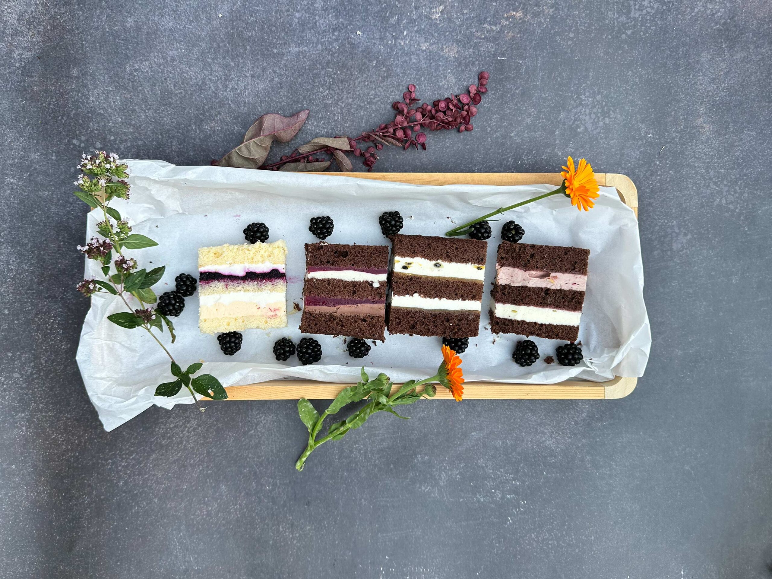 Um euch die Entscheidung für eure perfekte Hochzeitstorte zu erleichtern, biete ich Cake-Tasting-Boxen mit vier verschiedenen Geschmackskombinationen an. So könnt ihr in Ruhe probieren und herausfinden, welche Aromen und Böden am besten zu eurem Hochzeitsthema passen.